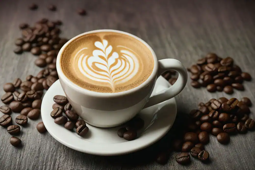 A cup of coffee with leaf-shaped latte art sits on a sunlit wooden table in a cozy cafe NYC, with light and shadows creating a warm, inviting atmosphere.